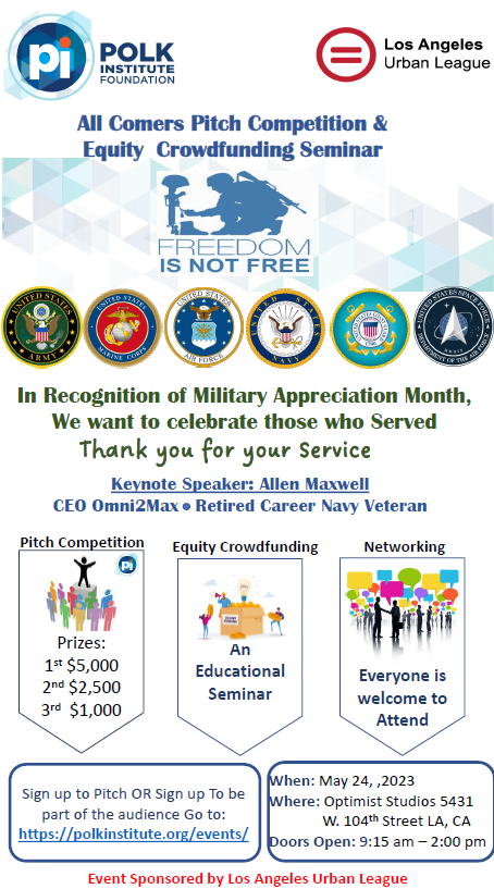 In Recognition of Military Appreciation Month, The Polk Institute Presents a great three-part fun event…An educational seminar on How Equity Crowdfunding Works, (This is the third and last Equity Crowdfunding series event). An exciting Pitch Competition, and fun Networking opportunity.