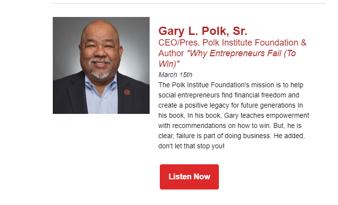 Los Angeles, CA…As a Black businessman, CEO, business consultant, university professor and author, Polk is passionate about entrepreneurs…and why they succeed or fail. His initial book, Why Entrepreneurs Fail (to Win), is widely used as a textbook in college entrepreneurship programs…